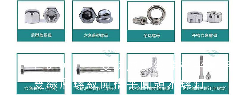 1、Flat:平頭 (鎖入后,頂部與工作件齊平)2、Oval:色拉頭、O頭、半沉頭 3、Round:圓頭 4、Pan:圓扁頭 5、Truss:大圓扁頭 6、Hex:六角頭 A-5:Finish Code/外觀處理。公制自攻螺絲 :于品名后方直接標示 Tapp 六角頭螺釘Hex cap screw與大六角螺栓Hex bolt 顧名思義為頭部為六角型的外螺紋扣件,設計為使用扳手轉動。依照ASME B18.2.1標準,六角頭螺釘(Hex cap screw)較一般的大六角螺栓(Hex bolt)的頭高和桿長公差小,因此ASME B18.2.1六角