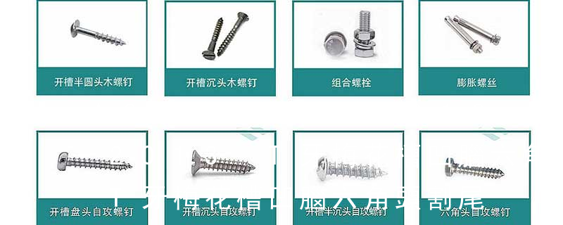 主要分類包括普通螺絲、機螺絲、自攻螺絲和膨脹螺絲三種。有頭螺釘Cap screw 過去限于全牙的扣件。六角頭螺釘Hex cap screw與大六角螺栓Hex bolt 顧名思義為頭部為六角型的外螺紋扣件,設計為使用扳手轉動。依照ASME B18.2. Phill 十字槽Serra-tion 墊下帶花Flower Head 開花頭6-bobes recess 內梅花Piston bolt 活塞螺釘Winding bolt 線圈螺釘Hexagon head bolts-full thread 六角頭螺栓 全螺紋Carriage bolt 馬車螺栓Square head bolt-product grade C 方頭